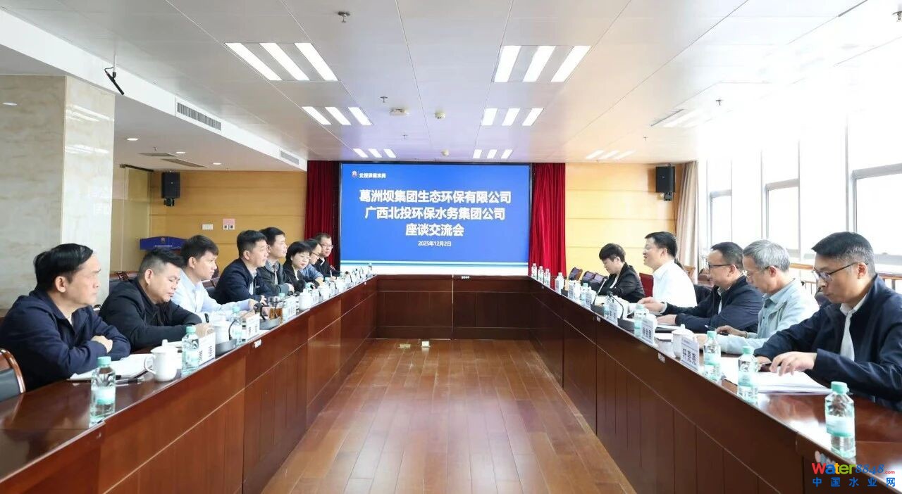 12月2日,中国能建葛洲坝生态环保公司党委书记、董事长杨贞武与广西北投环保水务集团有限公司党委书记、董事长、总经理张源翀会谈。双方围绕深化市场合作、推进北海市备用(第二)水源建设工程PPP项目收官及委托运营工作进行深入交流并达成共识。